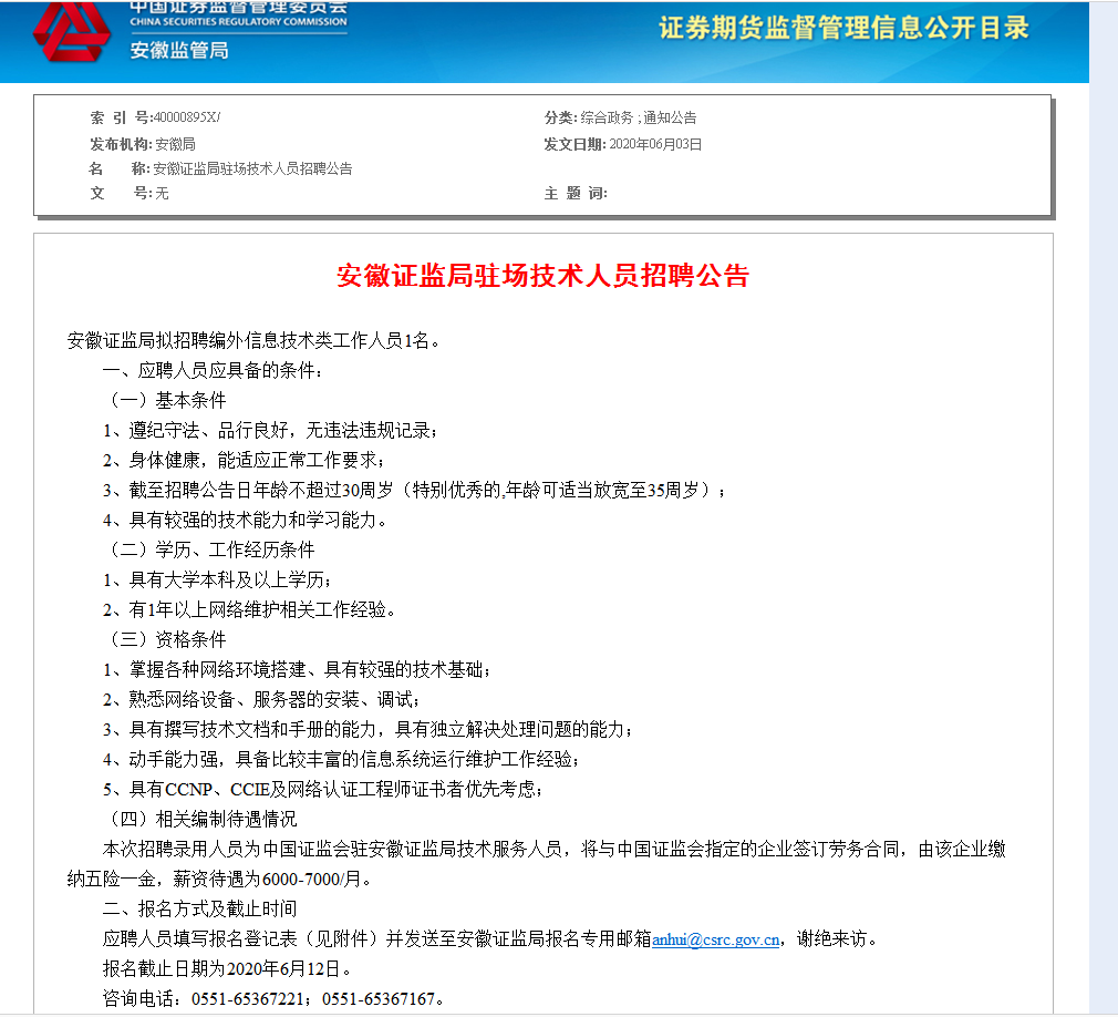 安徽證監(jiān)局駐場技術(shù)人員招聘公告