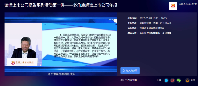 為落實中國證監(jiān)會2022年“5·15全國投資者保護(hù)宣傳日”活動要求,提高投資者的理性投資意識,我會于2022年5月9日舉辦“讀懂上市公司年報”專題講座。講座由安徽合力獨董、原東華科技董秘羅守生主講,點擊量達(dá)5.3萬余次。